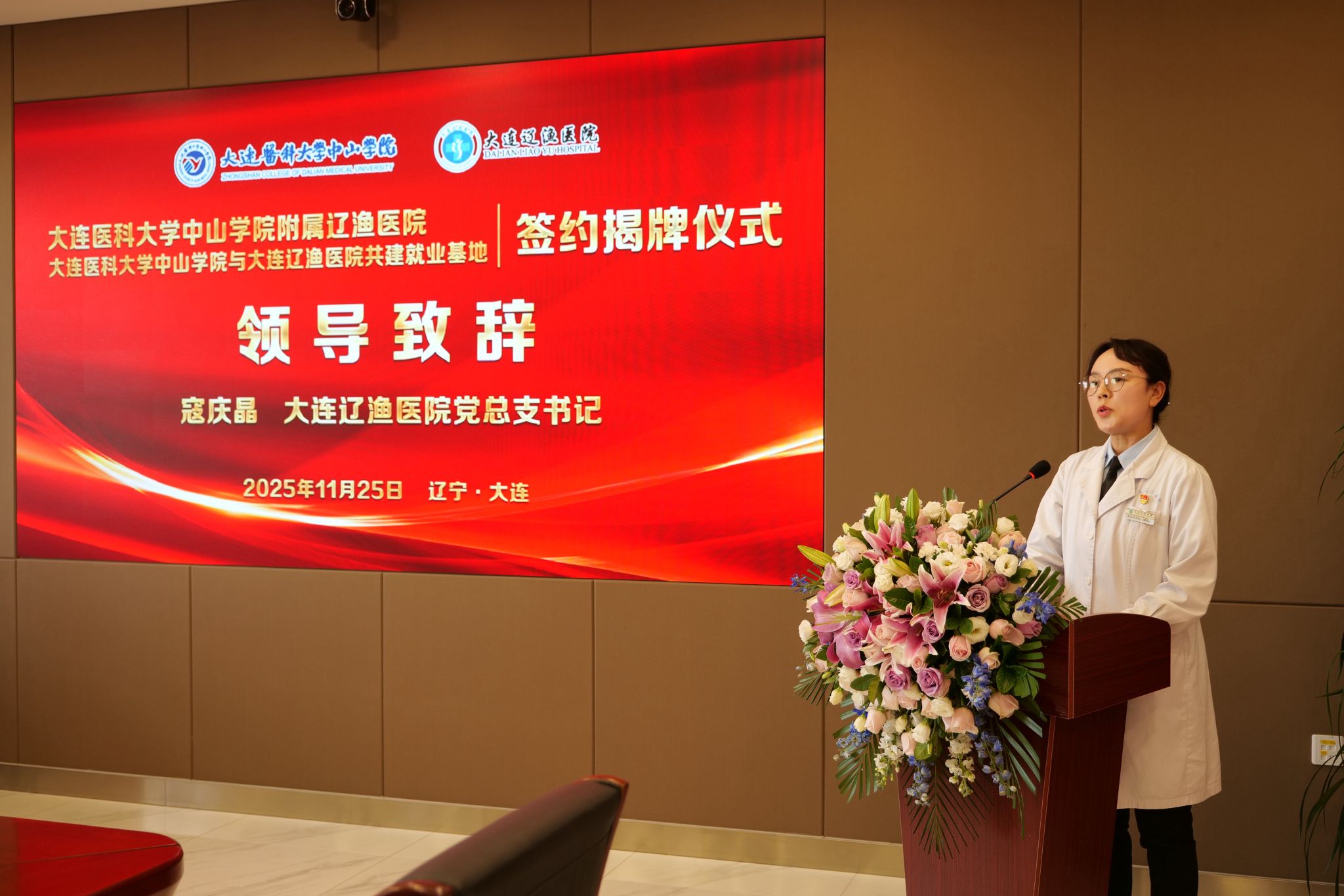 2025年11月25日,我校与大连辽渔医院建立附属医院合作关系及共建就业基地签约授牌仪式在大连辽渔医院门诊楼六楼会议室隆重举行。院长兼党总支书记钟凤宏、常务副院长张鹏、院长助理兼教务处处长刘大粼、院长助理兼学生工作处处长王琪出席活动仪式,办公室主任张佳玺、招生就业部部长谷丽、临床医学院常务副院长马路列席会议。仪式由大连辽渔医院院长助理蒋春红主持。