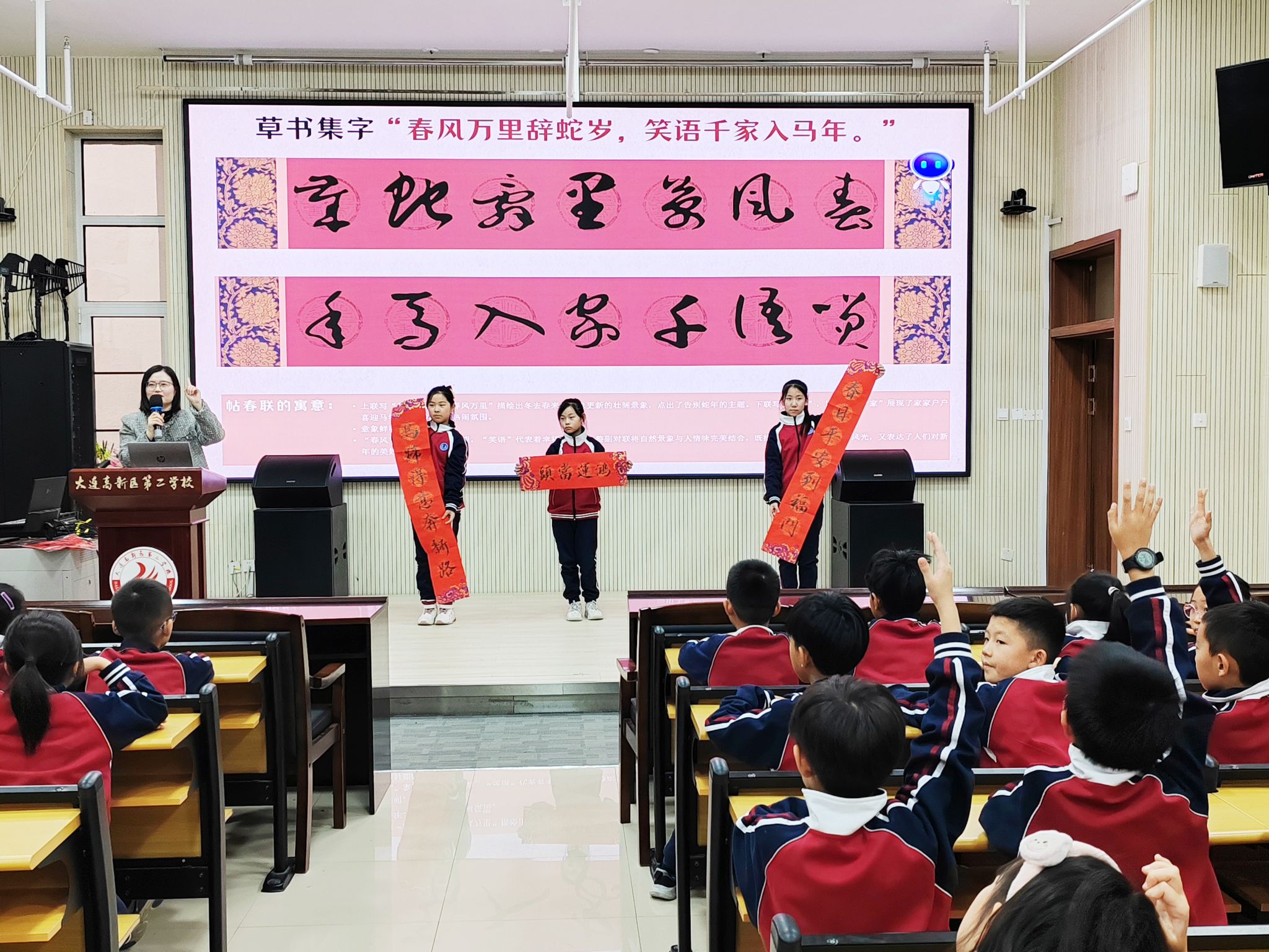 美育,是“润物细无声”的滋养,它以无形却强大的力量,悄然渗透进人们的心灵深处,成为点亮心灵的熠熠火种。为将这份蕴含着无尽美的力量播撒进更多青少年的心田,让他们在成长过程中沐浴在美的阳光里,12月12日,我校公共艺术教育教研部与艺术设计学院携手合作,精心筹备,将一堂充满墨香与年味的“春联讲堂”,送进了大连高新区第二学校,以实际行动积极践行高校“美育浸润”的责任担当,为青少年开启了一场探寻传统文化之美的奇妙之旅。